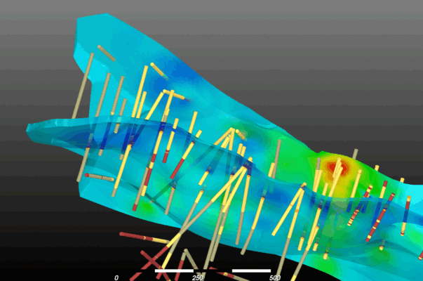 View two estimation results simultaneously in the 3D window with real-time cut-off adjustments. Evaluate functions on regular grids or directly on a geological model to get volume-weighted grade averages. The information panel displays tonnage, grade, and volume for any cut-off — no separate reporting step needed.