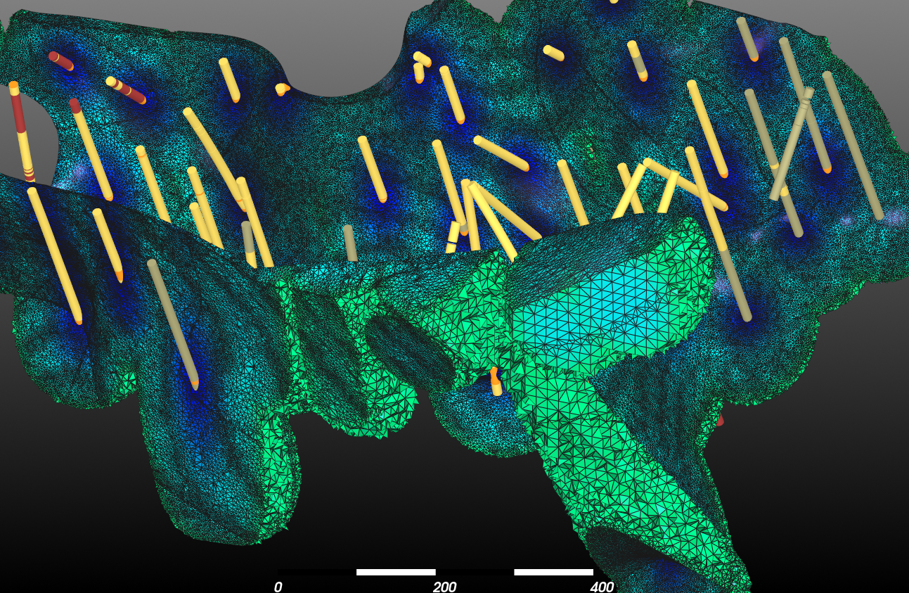 Estimate structural orientation from grade data to validate if grades are correlated to structure. Highlight main structural trends from structural surfaces interpolated directly from structural measurements.
